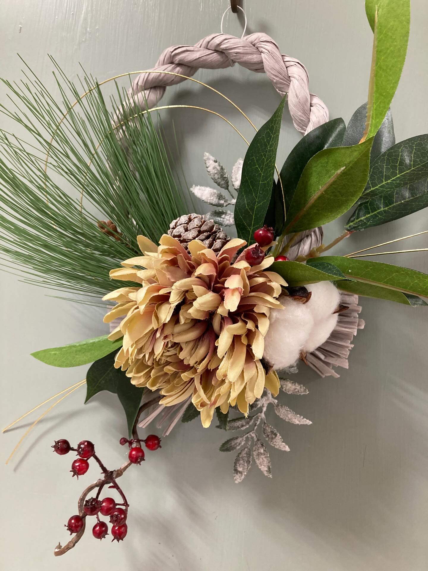 薄いラベンダー色のポインセチア、ベリー、シナモンなどでちょっと落ち着いた雰囲気になっています